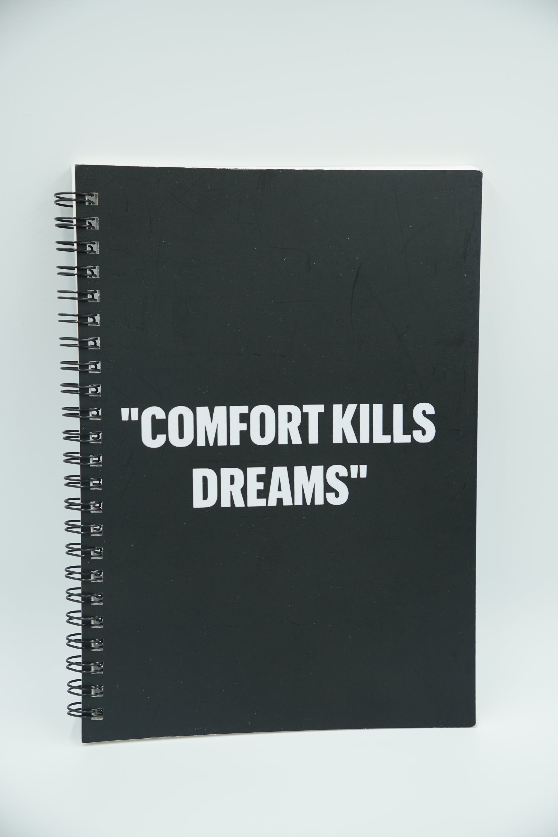 Disrupt the ordinary with this striking A5 notebook that serves a daily dose of tough love: "Comfort Kills Dreams". The bold typography on a stark black backdrop keeps your ambition front and center—because greatness lives outside your comfort zone.