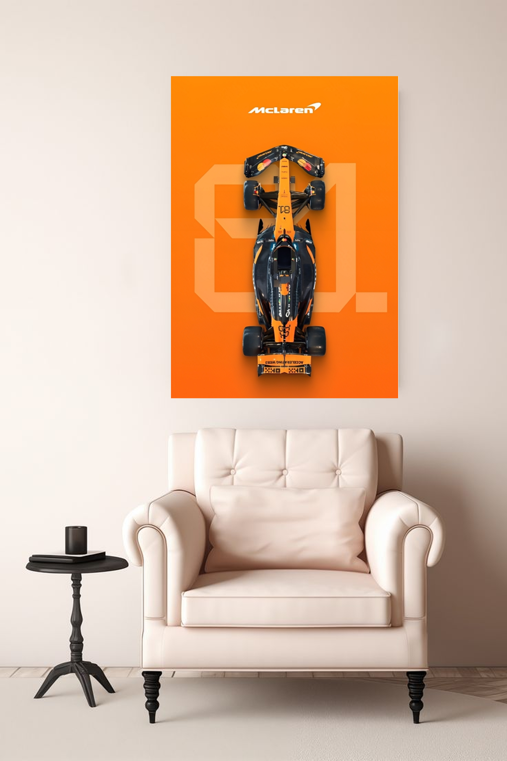 The sleek McLaren F1 car from an overhead view in its signature papaya orange. A clean, aesthetic A4 sticker poster for racing and motorsport enthusiasts. Bring the track home