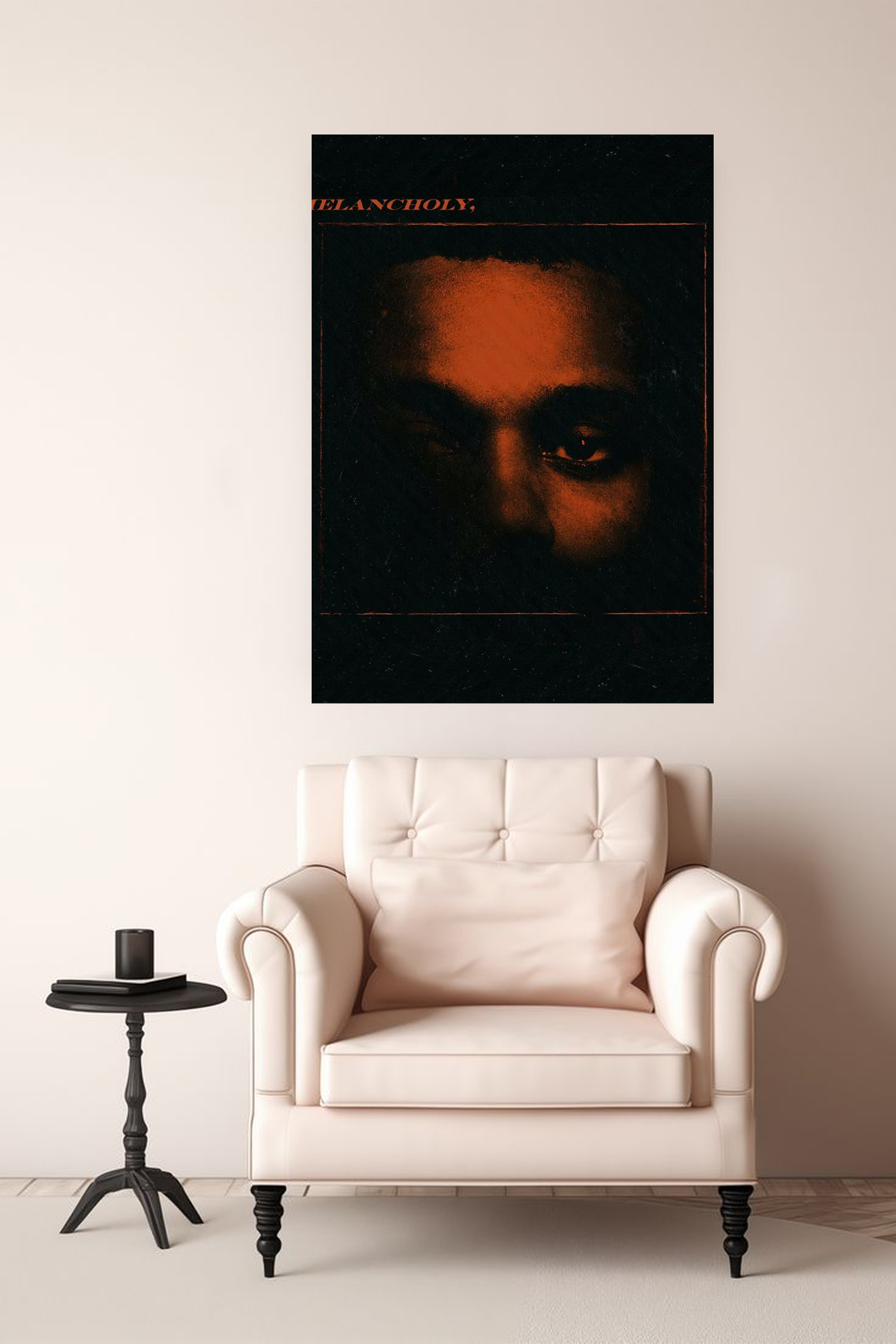 Dark, intense, and mysterious. This striking A4 sticker wallposter captures a powerful, close-up shot of The Weeknd with an intense orange/red spotlight effect, resembling the moody aesthetic often associated with his music like the Trilogy mixtapes.