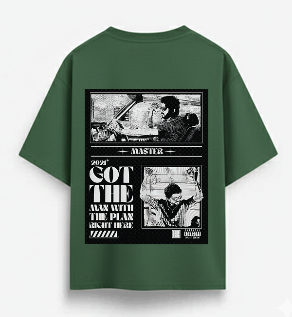 Back: A detailed, street-art-style graphic print featuring two intense moments of Vijay from the 2021 blockbuster. The design is complemented by a powerful quote-inspired text: "GOT THE MAN WITH THE PLAN RIGHT HERE"—a nod to J.D.'s ultimate control.